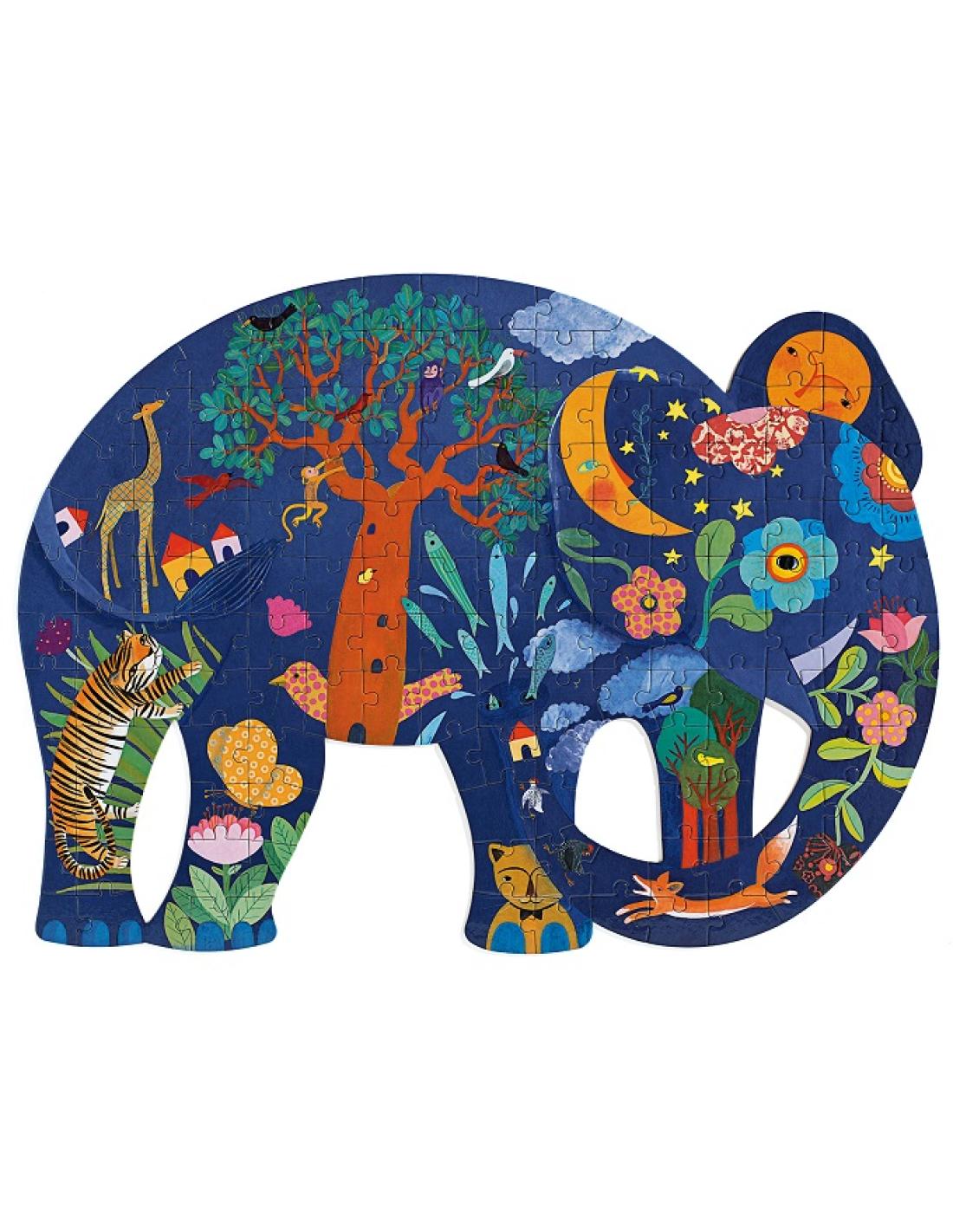 Le Puzz'Art Elephant est un puzzle de 150 pièces. Dans un format inédit, sans coin ni bordure, tout l'art du puzzle est bousculé. L'enfant découvre à travers cette grande silhouette ajourée un éléphant, dans lequel fourmille un monde imaginaire.