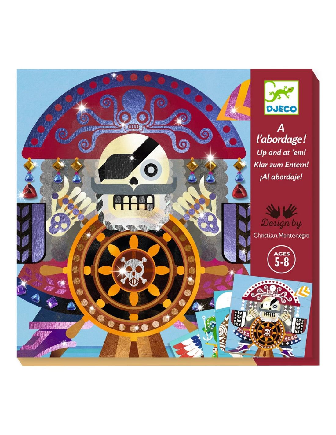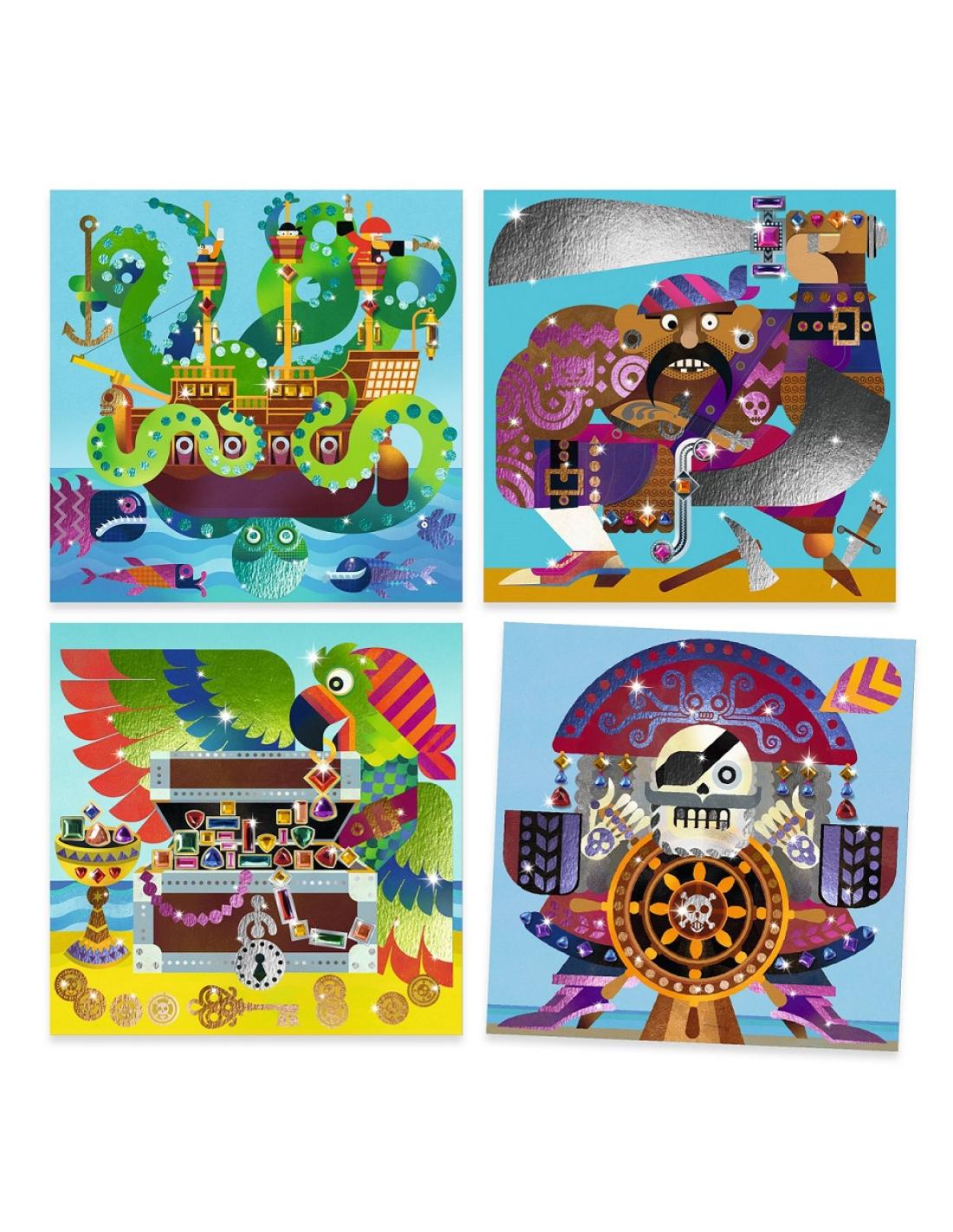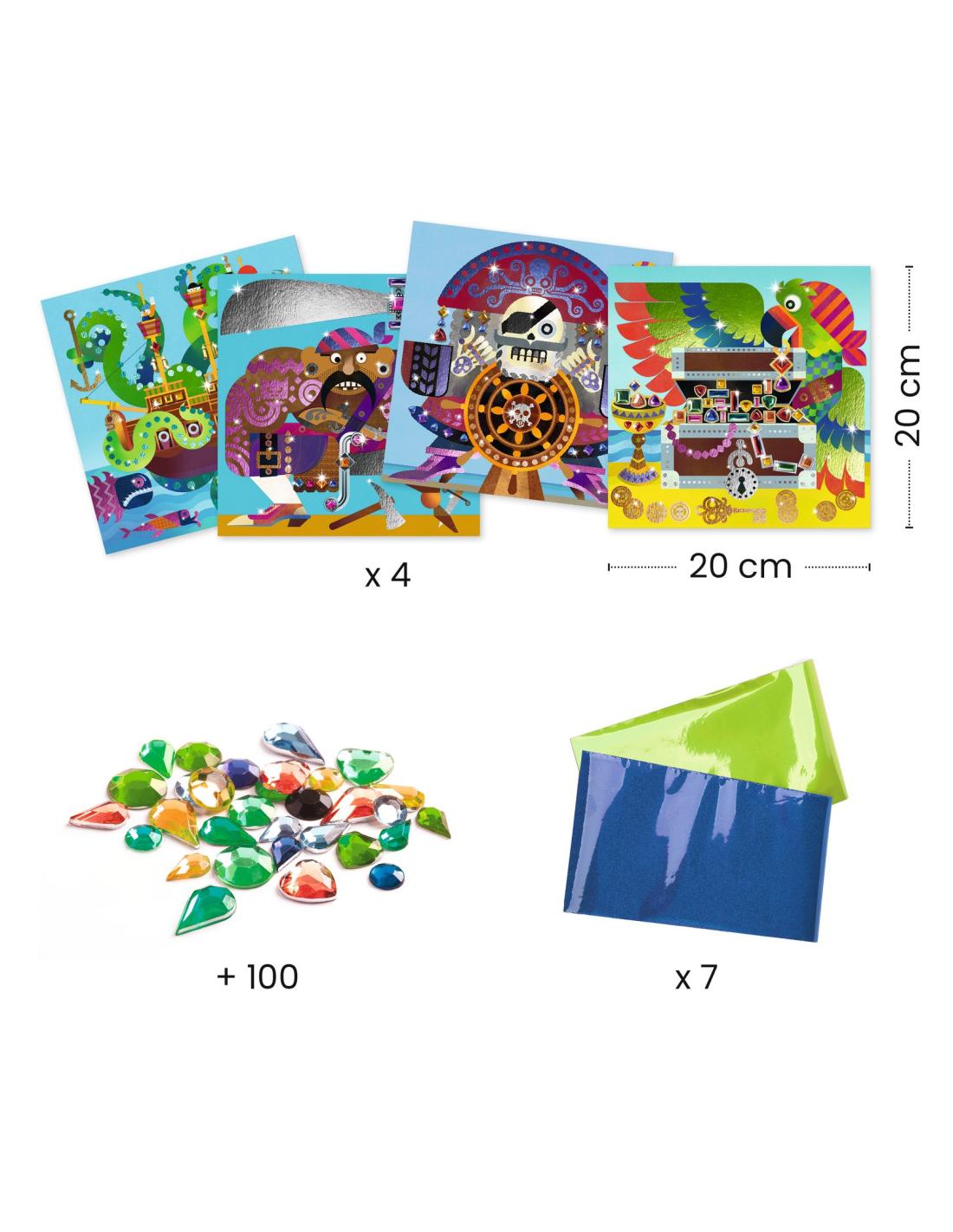 À l'abordage ! Une activité de collage pour décorer 4 tableaux sur le thème des pirates avec des feuilles métallisées et strass. Grâce au code couleur indiqué sur les planches, l'enfant repère les zones à métalliser. À l'aide de l'outil, il dévoile la pellicule protégeant la surface encollée, puis y dépose la feuille métallisée. La matière se dépose comme par magie ! Il colle ensuite les strass et les tableaux s’illuminent.