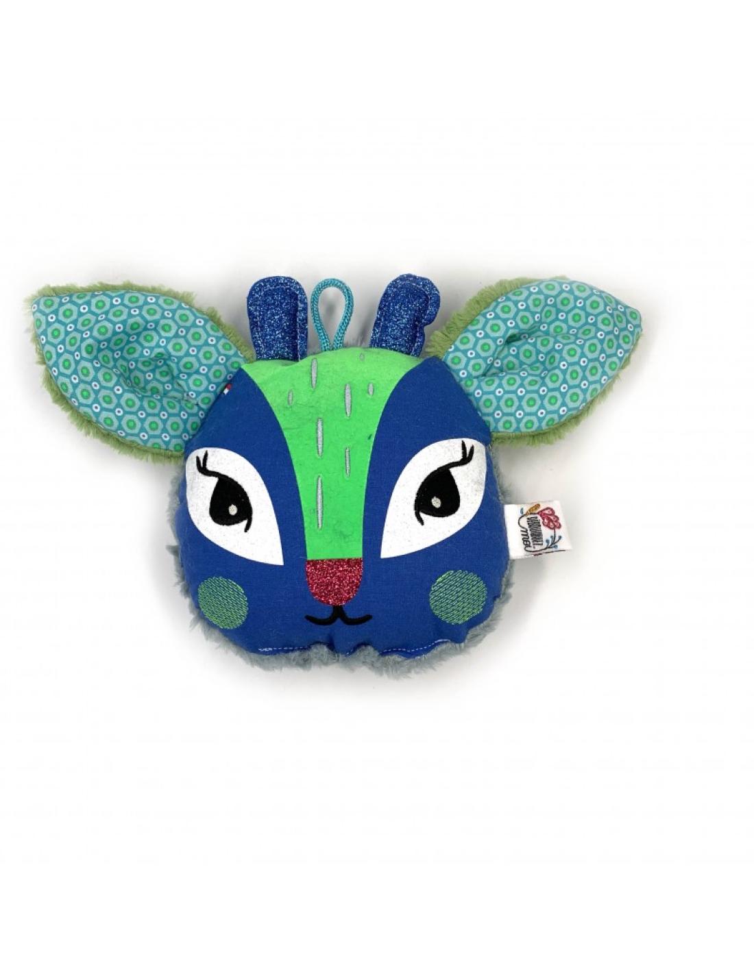 Ce coussin en forme de bichette a été créé par l'atelier Déboutonnez-moi. Il est composé de tissu coton bleu, de fourrure mint et verte, de flex et de broderie. C'est une belle idée cadeau pour un anniversaire, une naissance ou encore une crémaillère, ou tout simplement pour le plaisir. Avec ses tons colorés, il plaira aux enfants comme aux adultes !