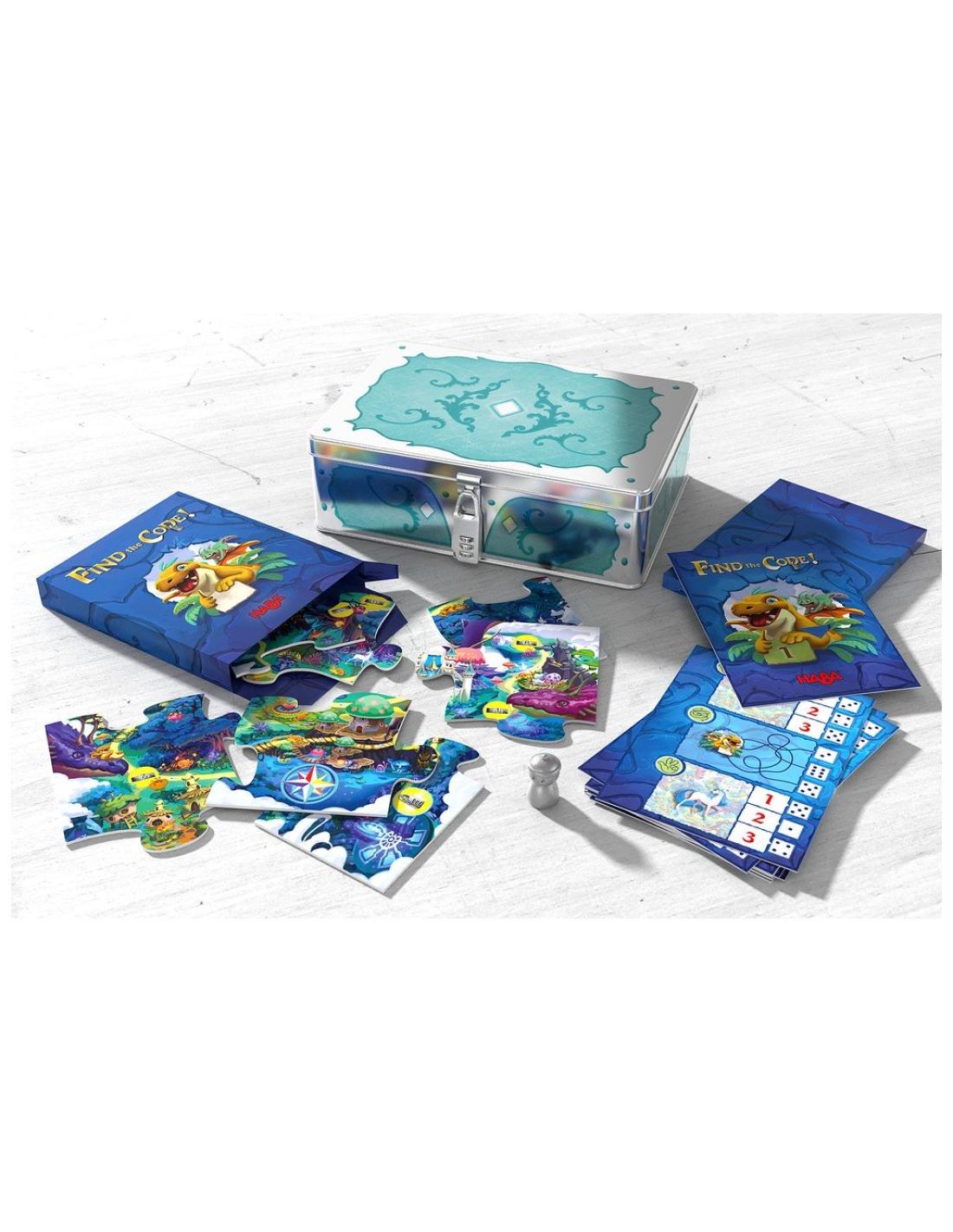 3. Déchiffrer le code à 3 chiffres : assembler les pièces du puzzle pour former une carte au trésor, poser la figurine sur la case de départ et résoudre ensemble les 3 énigmes de la carte-énigme. Les solutions indiquent le nombre de cases pour faire avancer la figurine. Chaque case sur laquelle atterrit la figurine indique un chiffre du code.