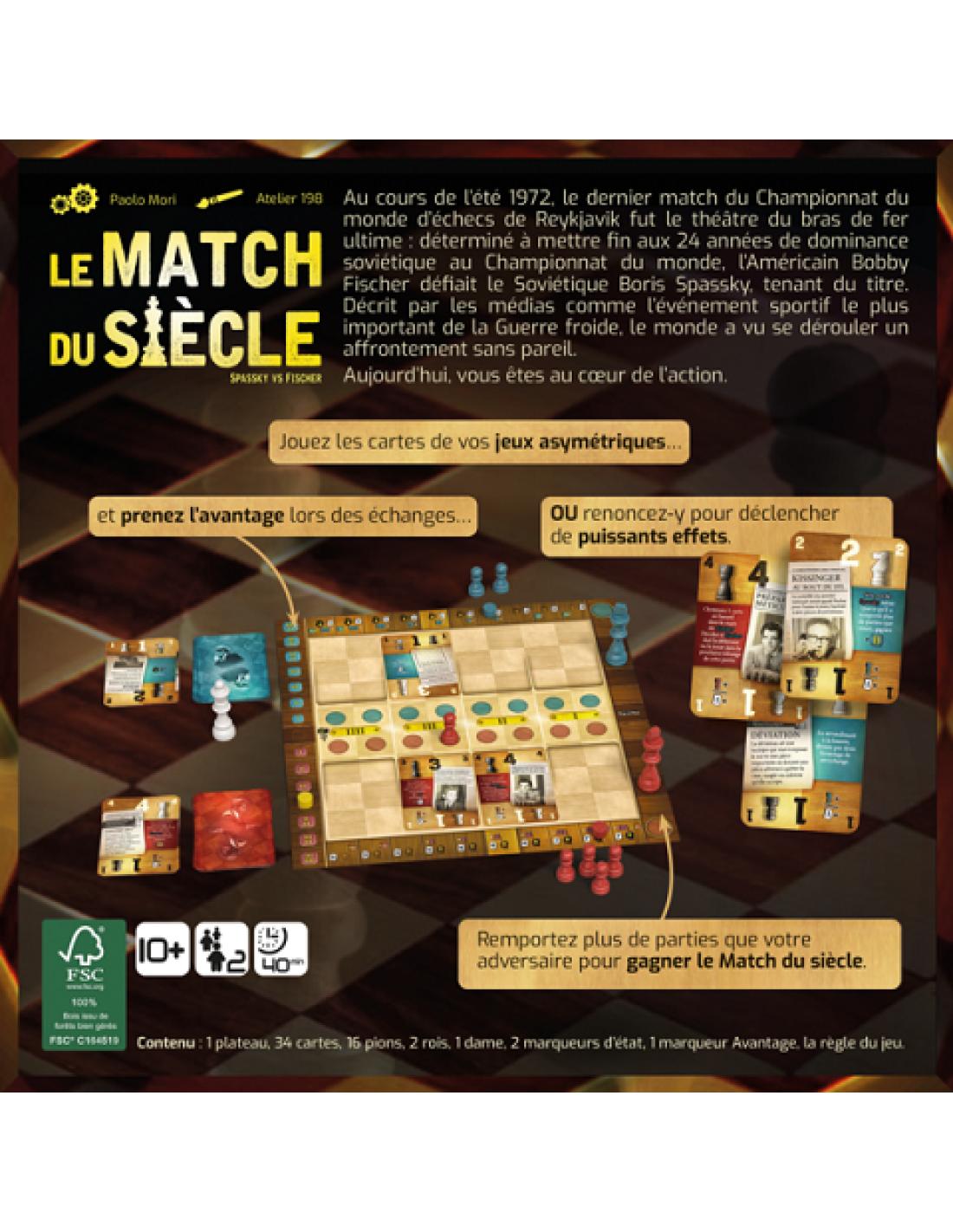 Le match du siècle nous propulse au cœur de la guerre froide lors de la finale mondiale d'échec de 1972, entre Bobby Fischer et Boris Spassky. Tension permanente et choix cornéliens vous attendent dans ce duel au sommet : jouez les cartes de vos jeux asymétriques et prenez l’avantage lors des échanges ou renoncez-y pour déclencher de puissants effets. Remportez plus de parties que votre adversaire pour gagner le Match du siècle.