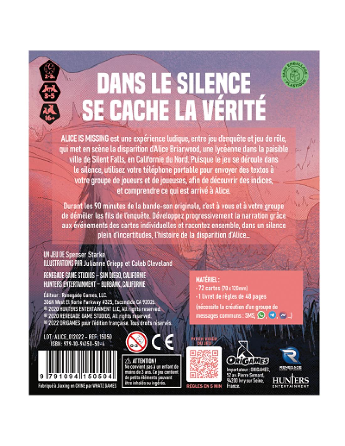 Alice is Missing, est une expérience ludique, entre jeu d’enquête et jeu de rôle. Alice Briarwood, une lycéenne de la paisible ville de Silent Falls en Californie du Nord, a disparu. Le jeu se déroule dans le silence. Utilisez votre téléphone portable pour envoyer des textos à votre groupe de joueurs et de joueuses, afin de découvrir des indices, et comprendre ce qui est arrivé à Alice. Durant les 90 minutes de la bande-son originale, c’est à vous et à votre groupe de démêler les fils de l’enquête. Développez progressivement la narration grâce aux événements des cartes individuelles et racontez ensemble, dans un silence plein d’incertitudes, l’histoire de la disparition d’Alice...