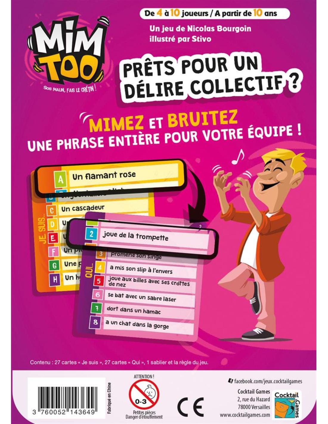 Si vous parvenez à faire deviner cette combinaison à votre équipe avant la fin du sablier, vous marquerez les points indiqués sur les cartes ! saurez-vous faire deviner à vos partenaires « un vampire... passe des cailloux au mixeur ! », « le père noël... joue au foot avec un chaton ! » ou encore « un contorsionniste... qui chasse les mouches ! » ? Quelles seront les phrases les plus délirantes parmi les 200 000 combinaisons ?