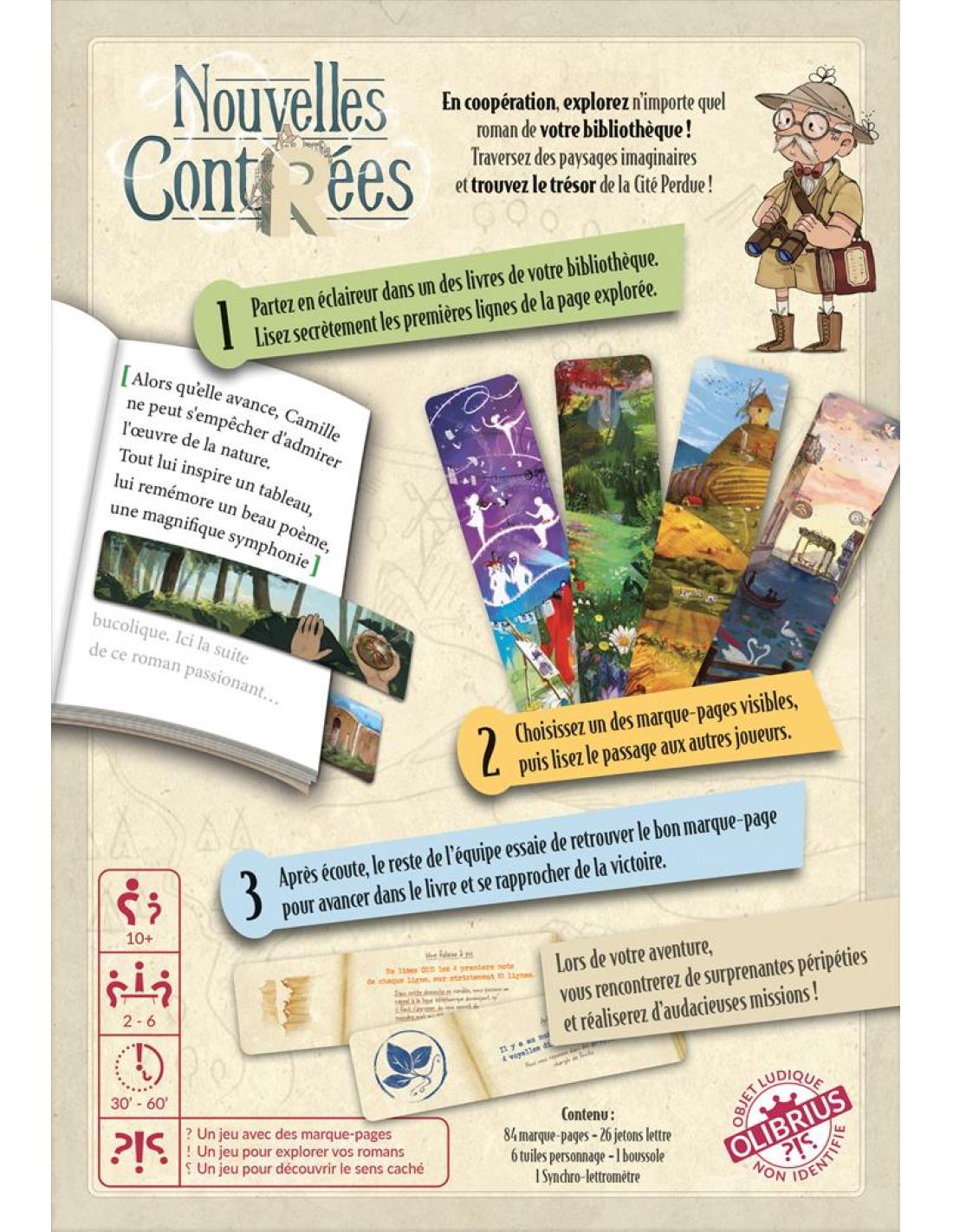 Et si vous pouviez explorer les livres, parcourir les textes des romans, traverser les paysages littéraires et leurs imaginaires, vous surprendre de quelques phrases incroyables... Nouvelles ContRées est un jeu coopératif qui vous invite à ce voyage onirique. Vous devenez des explorateurs de romans, vous dirigeant au mieux dans la jungle des mots, jusqu’à trouver, au cœur du roman, l’incroyable sens caché du livre.