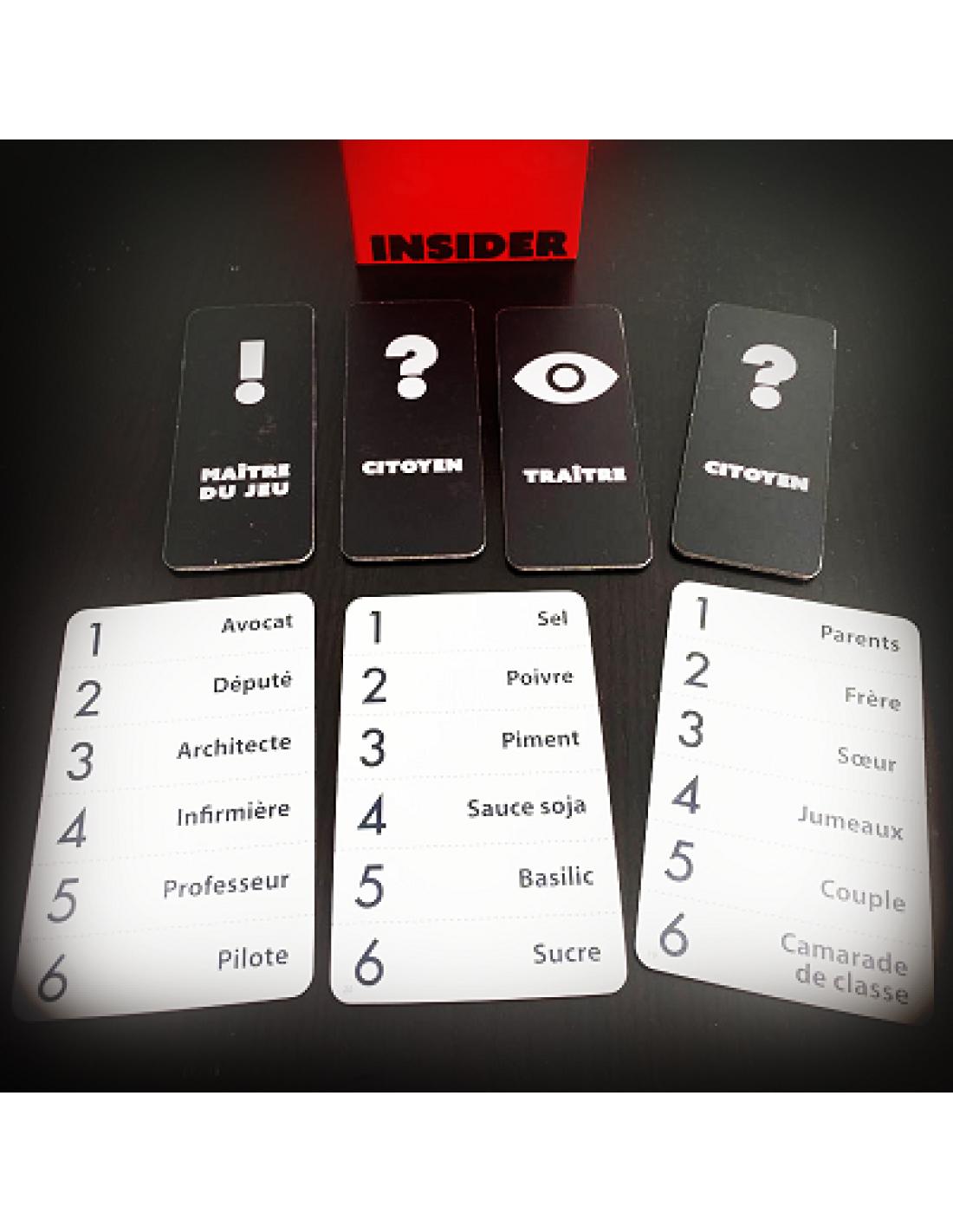 Un jeu simplissime : des cartes rôles sont distribuées aléatoirement pour 4 à 8 joueurs, désignant un maitre du jeu, un Insider (traitre), tous les autres joueurs sont d'honnêtes citoyens.