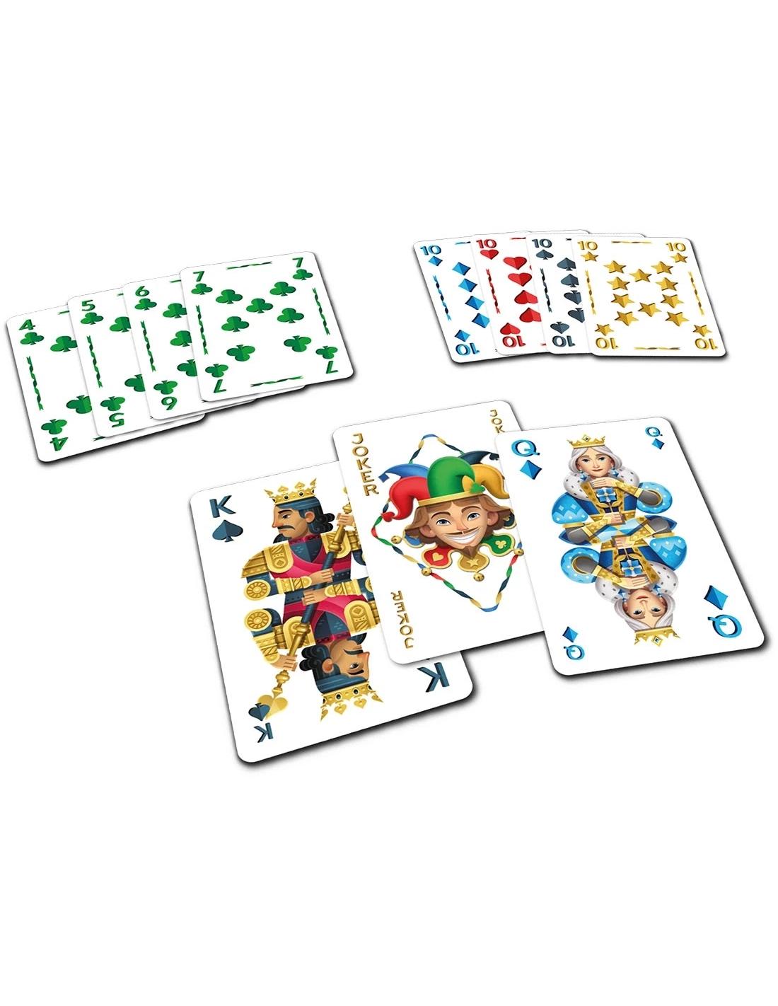 Les 5 couleurs : pique, coeur, carreau, trèfle et étoile permettent de faciliter l’arrangement de votre main en suite ou en famille. Au fur et à mesure des manches, les joueurs joueront avec une carte de plus et l’atout changera en fonction : si le tour est joué avec 5 cartes, l’atout pour cette manche sera le 5... Faites les bonnes combinaisons pour vous débarrasser en premier de vos cartes et pour marquer manche après manche le moins de points possible.