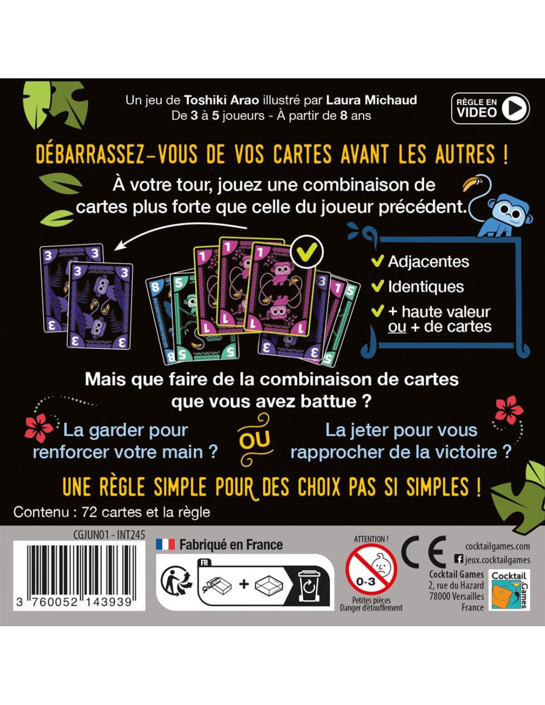 Jungo est un jeu de construction de main où le but est d’être le premier à se débarrasser de toutes ses cartes. À chaque tour, vous devez battre la combinaison sur la table en jouant des cartes adjacentes de même valeur de votre main... sans jamais les trier ! Plus vous jouez de cartes, plus la combinaison est forte. Si vous ne pouvez pas jouer, vous piochez une carte et décidez de la garder ou de l’exposer à tous. Le premier joueur à se défausser de toutes ses cartes remporte la partie.