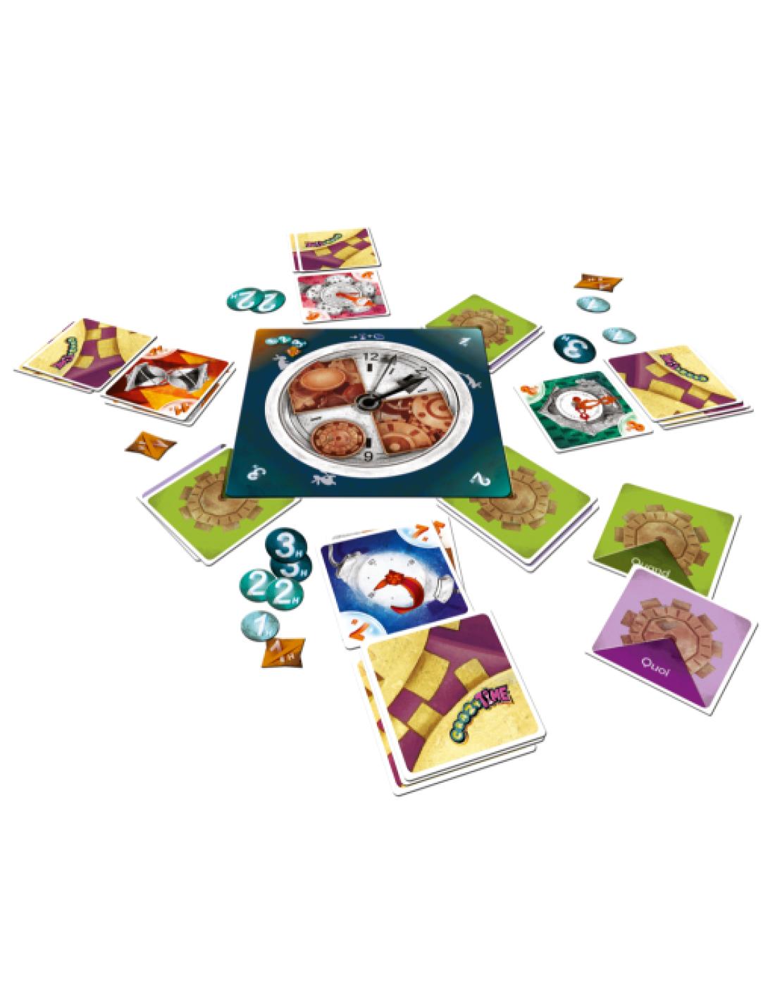 Comme une horloge comptez le temps qui passe : annoncez une heure puis retournez une carte. Celle-ci peut influencer ce que le joueur suivant doit dire ou faire, alors essayez de ne pas vous tromper. A la fin de chaque manche, les meilleurs quittent la pièce et ceux qui restent ajoutent une nouvelle règle ! Au cours de 4 manches, les joueurs n’ont donc pas tous connaissance des mêmes règles et ceux qui ne les connaissent pas doivent essayer de les déduire. Pour gagner, tentez d’accumuler des heures durant 3 manches, desquelles seront déduites les heures perdues à la dernière. Mode de jeu en équipe inclus, jusqu’à 14 joueurs ! Préparez-vous à un truc de fous !