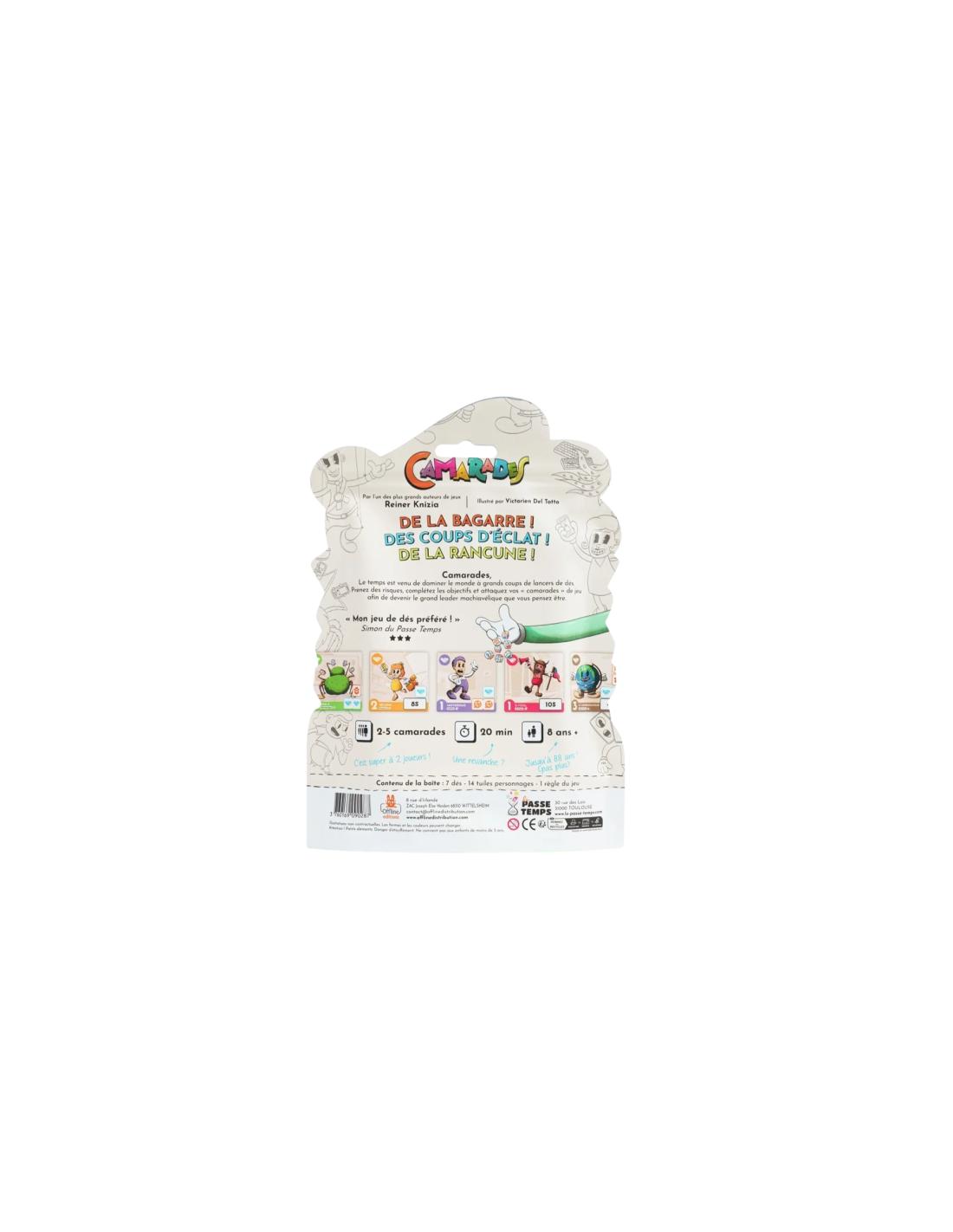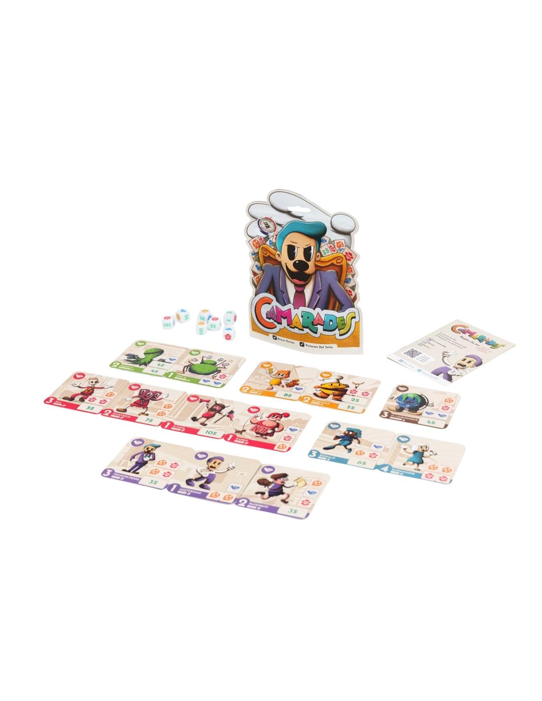 Par rapport aux autres jeux de dés, “Camarades” se distingue par son aspect vachard et jouissif. Il combine l’intensité du Risk avec une dimension euphorisante du Yam’s ou de Pickomino. Ce jeu est parfait pour celles et ceux à la recherche d’un jeu plein de coups d’éclat à jouer entre amis à l’apéro ou en famille, entre enfants ou entre adultes, que vous soyez aussi bien 2 que 5 camarades de jeux autour de la table (basse).