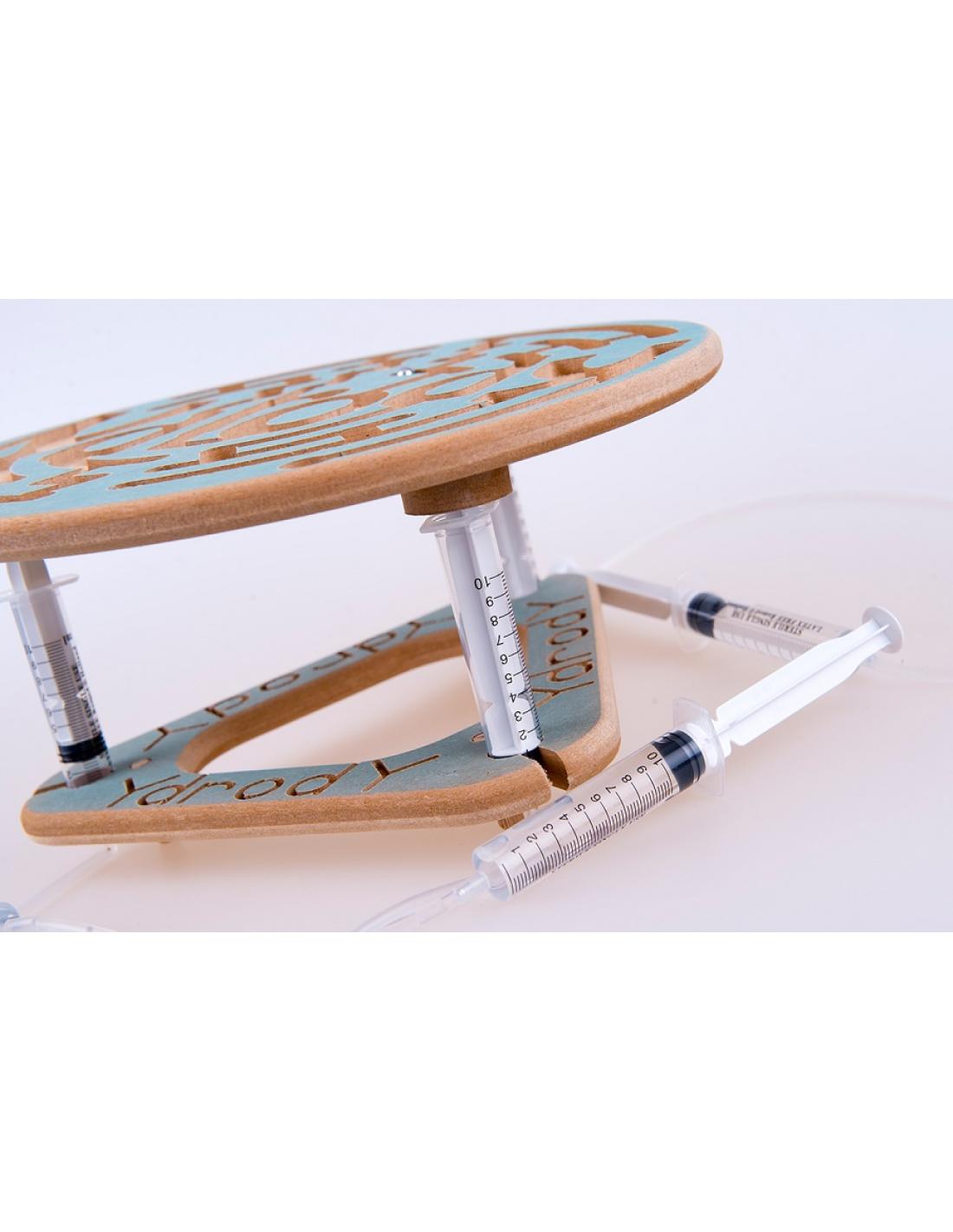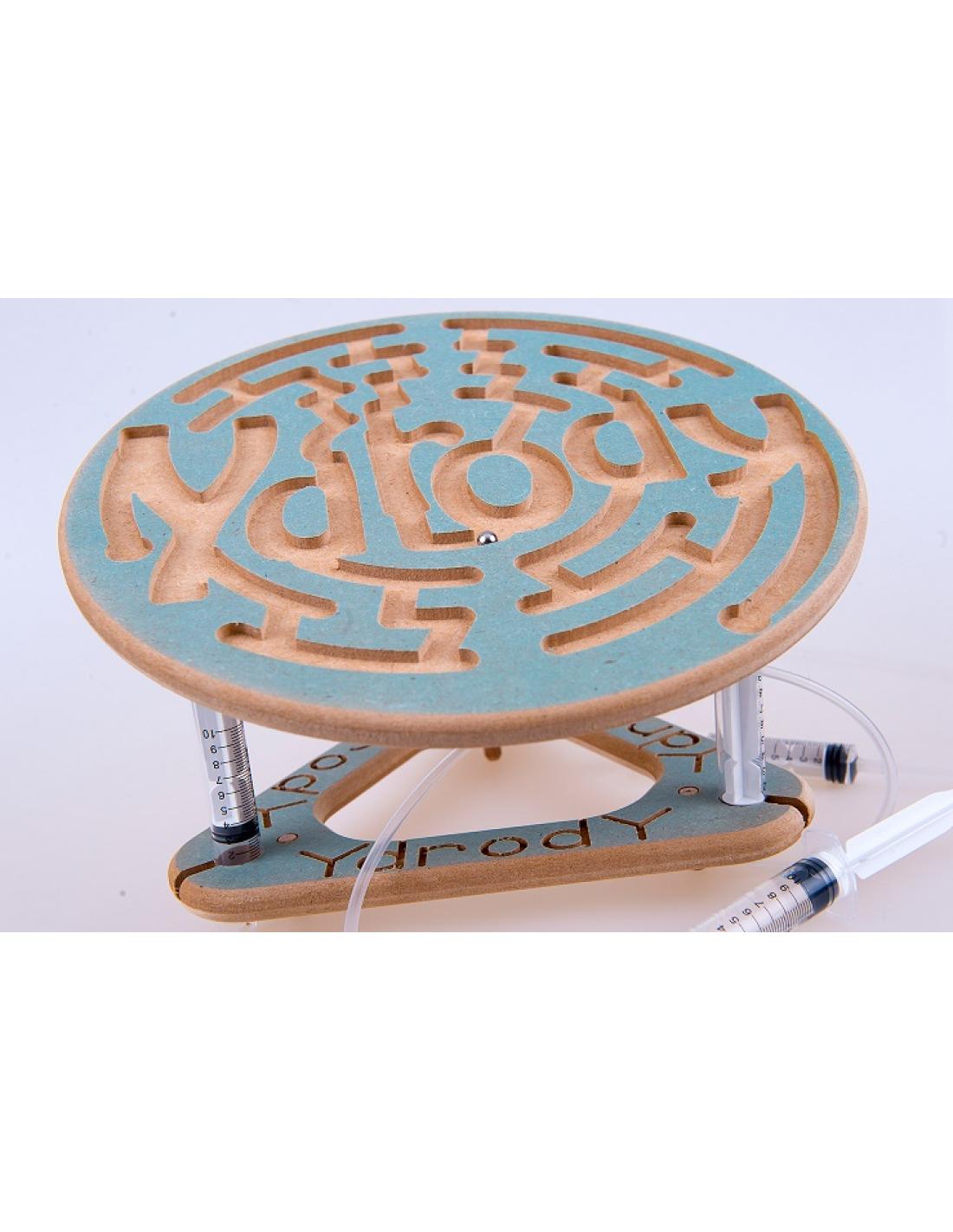 Faites circuler la bille à travers le labyrinthe en déplaçant le plateau à l’aide des seringues remplies d’eau.