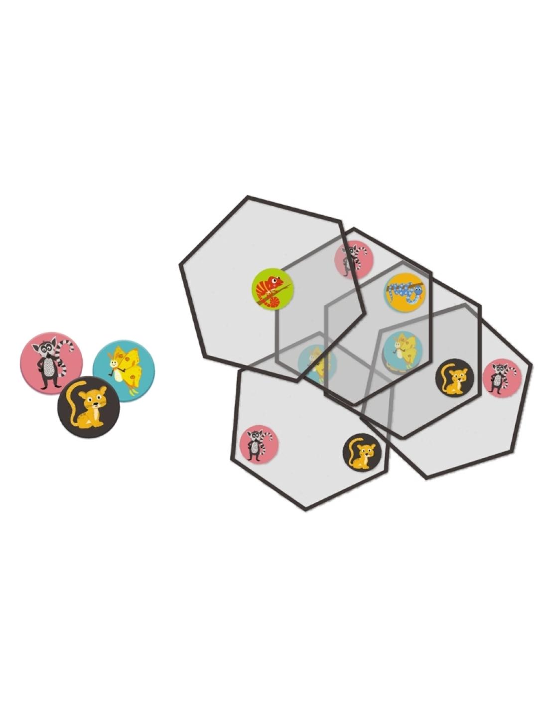 Superpose les cartes transparentes et essaie de créer un alignement de trois animaux similaires pour pouvoir récupérer un jeton !