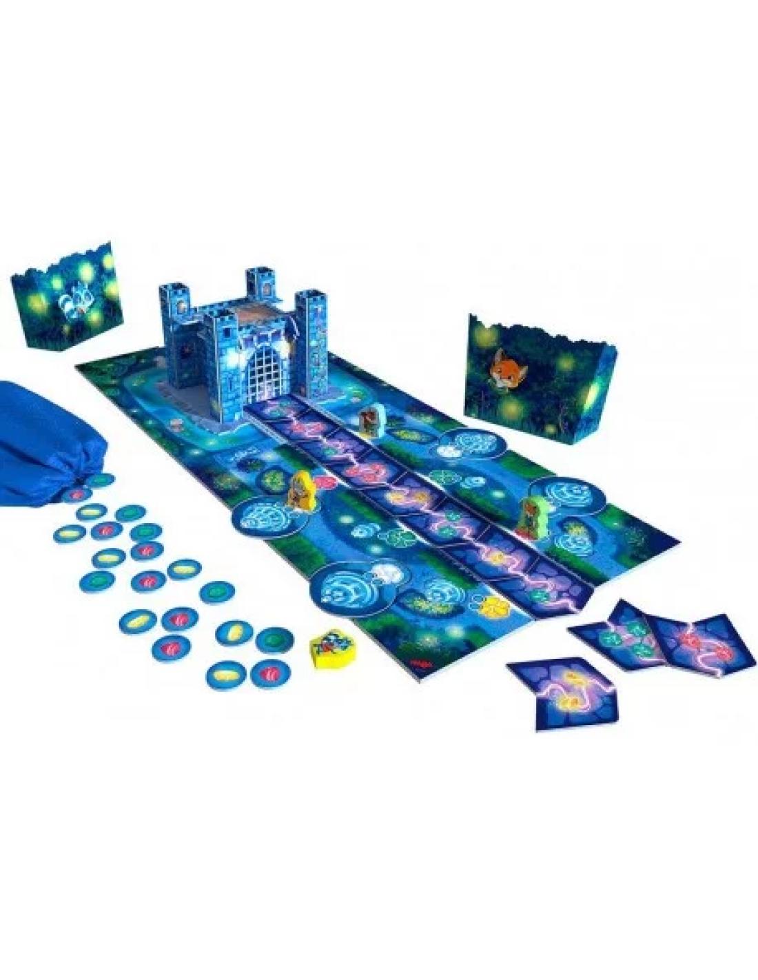 Contenu: 1 château (= 2 murs avec 2 tours, 2 murs latéraux et 1 toit), 1 plateau de jeu (= jardin du château), 1 sachet en tissu, 60 cailloux, 1 poussoir transparent, 4 fontaines, 27 tuiles de chemin « pierre précieuse » et 1 tuile de chemin magique, 4 figurines héros et 1 sorcier, 4 paravents, 1 marqueur « premier joueur », 1 règle du jeu.