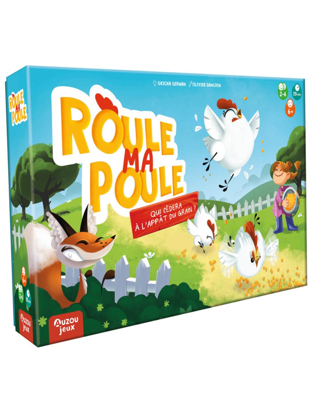 Contenu : 1 plateau, 3 poules en bois, 1 pion en bois, 30 grains en bois, 48 tuiles Action, 9 tuiles Pari