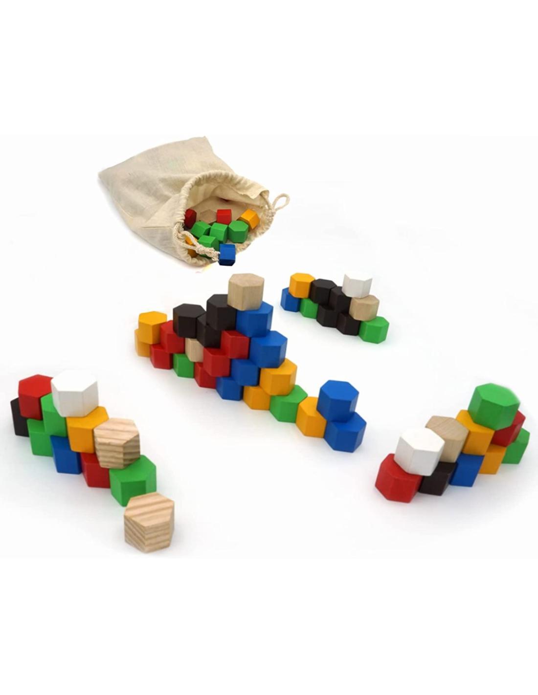 Contenu du jeu : 55 pièces en bois de différentes couleurs, 1 sac en toile, 1 règle du jeu