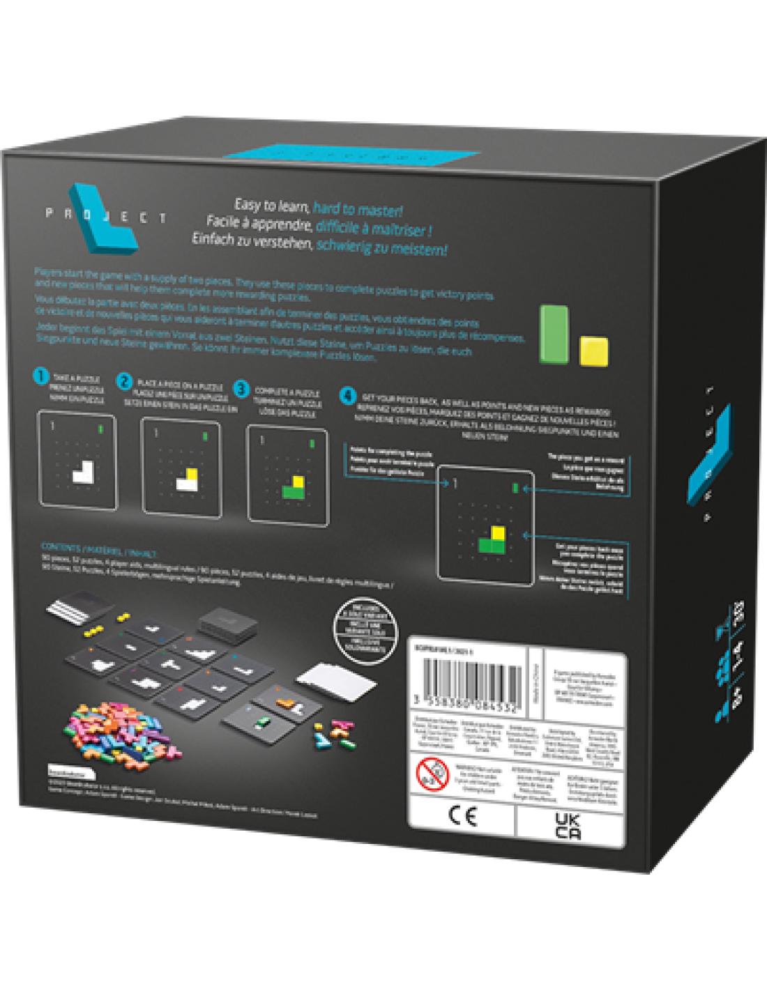 Project L est un jeu rapide alliant casse-tête 3D, pose de tuiles et de magnifiques pièces en acrylique. Mettez au défi vos amis dans un jeu au design simple, mais qui propose un casse-tête qui est loi de l’être. Les tuiles complétées vous permettront d’amasser de nouvelles pièces sur le chemin de la victoire. Serez-vous plus futé que vos adversaires ?