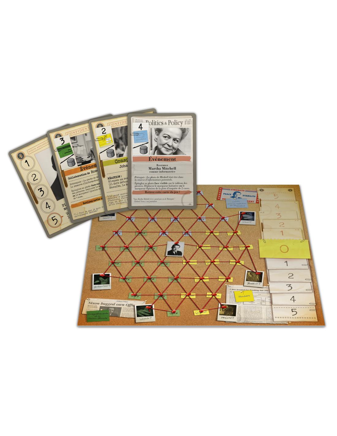Watergate est un jeu tactique plein de tension, qui invite les joueurs à effectuer des choix stratégiques cornéliens pour atteindre leurs conditions de victoire avant l’adversaire. Fort de sa thématique totalement imprégnée dans le jeu, il permet de créer des duels épiques sur fond de scandale politique.