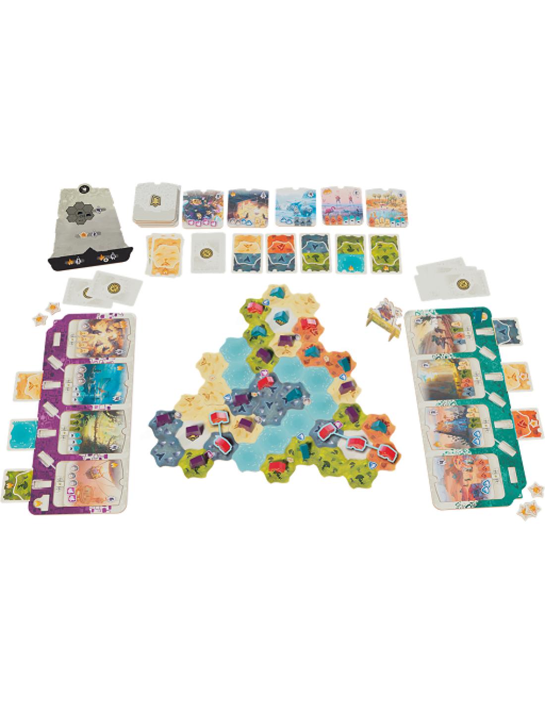 Chaque tour, vous devrez choisir entre piocher de précieuses cartes Terrain ou avancer sur la carte. Le moindre mouvement compte : vos camps bloquent, connectent ou ouvrent de nouvelles voies vers la victoire. Grâce à un système de placement malin, des objectifs à valider (tuiles Histoire) pour marquer plus de points et des effets de terrain variés, chaque décision tactique impacte votre score final. En plus de la conquête de territoires, vous devrez maîtriser le feu, récolter des baies et connecter vos camps pour maximiser votre score. Tout en mettant des batons dans les roues de vos adversaires !