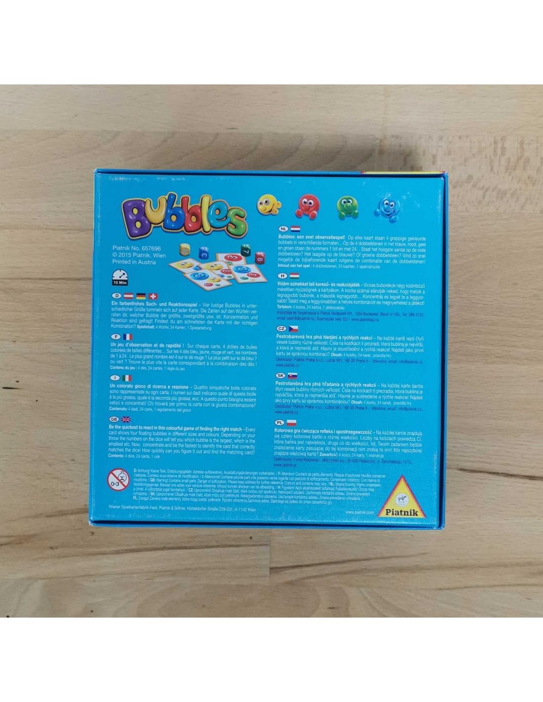 Sur chaque carte, 4 drôles de bulles colorées de tailles différentes... Sur les 4 dés bleu, jaune, rouge et vert, les nombres de 1 à 24.