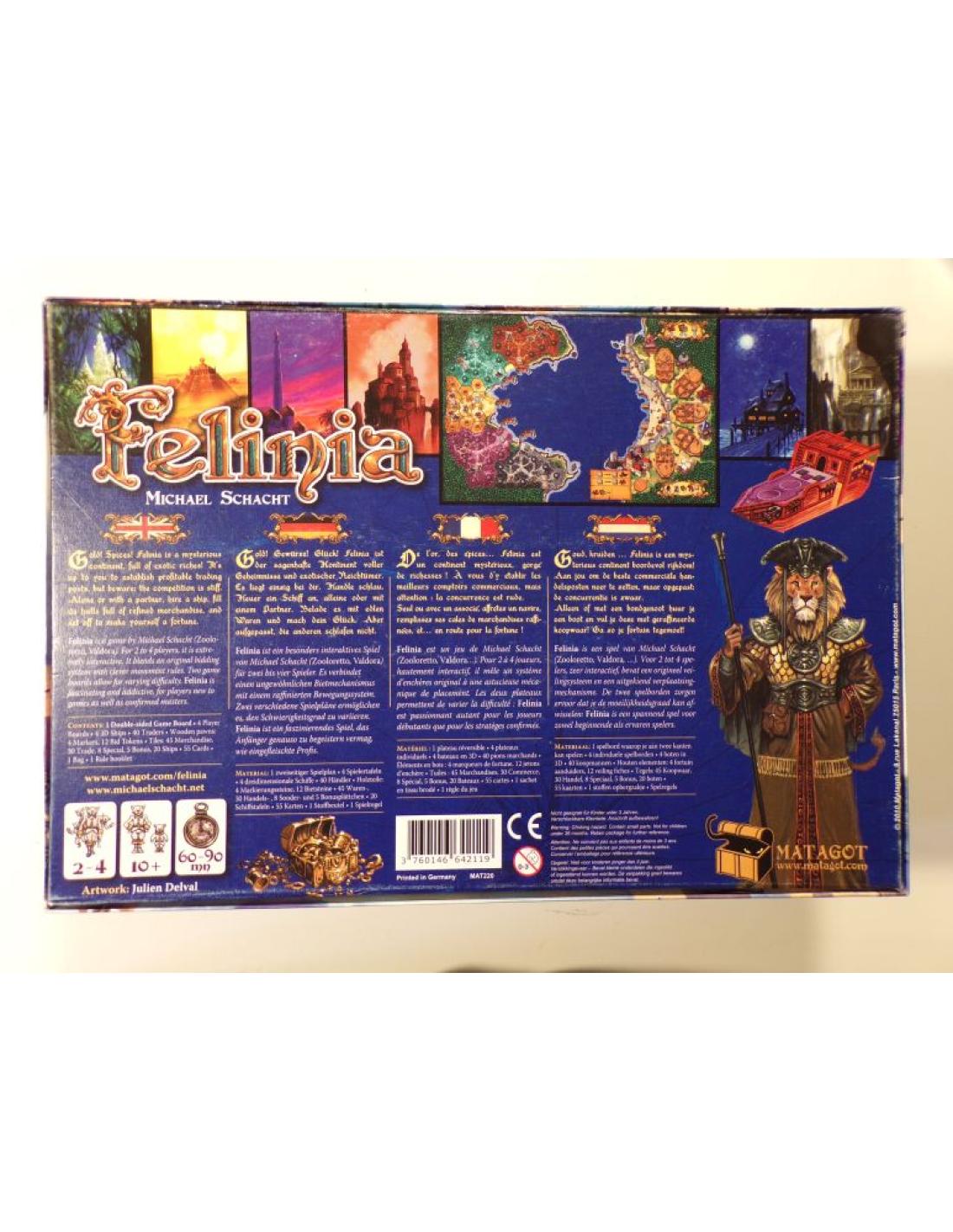 Dans la cité de Katzburg les marchands sont en effervescence. Le bourgmestre, HenryCat, a signé un accord de coopération avec le continent de Felinia. Contre des marchandises précieuses (livres rares, vins exceptionnels, horlogerie de précision, habits luxueux ou verreries raffinées), les peuples de Felinia acceptent d’installer chez eux des comptoirs commerciaux. Mais les places sont limitées : il va falloir être très réactif ! Quatre navires sont en permanence affrétés par la ville pour se rendre sur l’un des cinq pays de Felinia. Pour y monter, il faut disposer d’une certaine combinaison de marchandises achetées aux différents marchés de la ville. Ce qui implique aussi de gagner de l’argent pour pouvoir monnayer ces achats... Le prix des marchandises est défini par l’offre et la demande et peut monter parfois très haut ! Mais c’est le prix à payer pour emprunter l’un des navires et espérer établir un comptoir commercial sur Felinia, et si possible, récupérer de l’or et des épices. Chaque joueur représente un groupe de marchands dont l’objectif est d’avoir le plus de points de Prospérité lorsque le dernier navire a quitté la ville de Katzburg