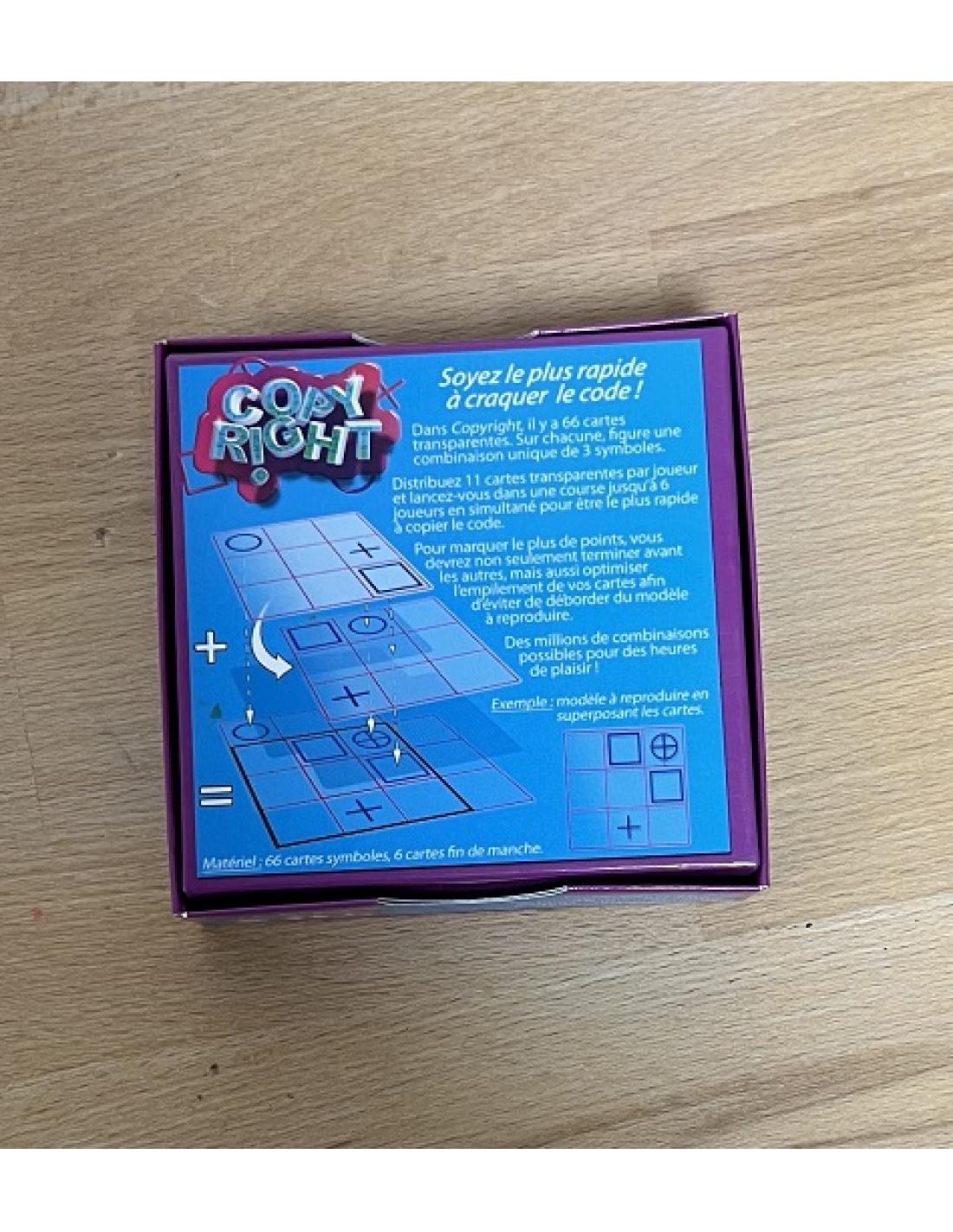 Dans Copyright , les joueurs doivent reproduire un motif le plus rapidement possible à l'aide des feuilles d'image transparentes qu'ils ont en main. Chaque feuille est une grille de 3 x 3 comportant un cercle, un carré et un plus dans trois de ses neuf carrés.