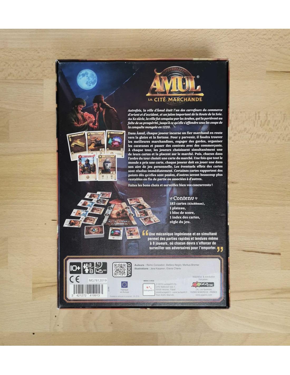 Dans Amul, chaque joueur incarne un fier marchand en route vers la gloire et la fortune. Pour y parvenir, il faudra trouver les meilleures marchandises, engager des gardes, organiser les caravanes et passer des contrats avec des commerçants. À chaque tour, les joueurs choisissent simultanément une de leurs cartes et la placent sur le marché. Puis, chacun dans l’ordre du tour choisit une carte du marché. Une fois que tout le monde a pris une carte, chaque joueur doit en jouer une dans son aire de jeu personnelle. Les éventuels effets des cartes sont résolus immédiatement. Certaines cartes rapportent des points dès qu’elles sont posées, d’autres seront beaucoup plus rentables en fin de partie ou associées à d’autres. Faites les bons choix et surveillez bien vos concurrents !