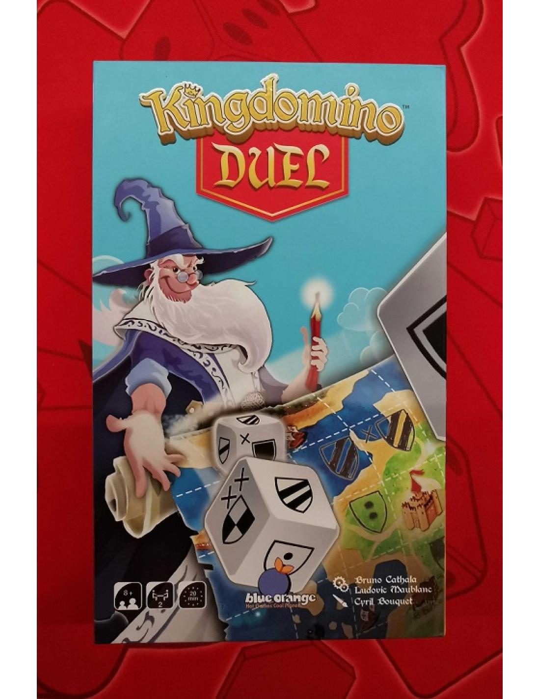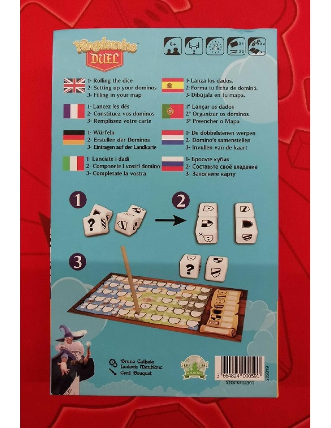 Kingdomino Duel est un jeu de dés dans lequel chaque joueur constitue un domino à son tour de jeu en associant 2 dés sélectionnés et le dessine sur sa carte. A chaque tour, le premier jour choisira 1 dé en premier et 1 dé en dernier. Les zones créées vont marquer des points de la même façon que dans le jeu d’origine.