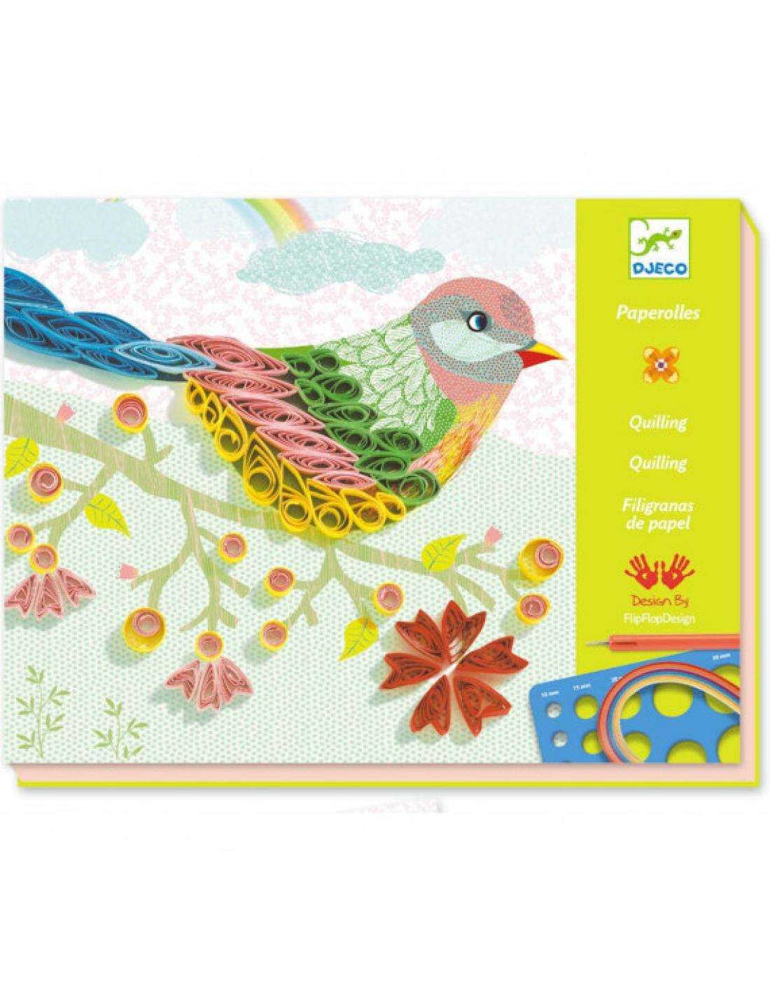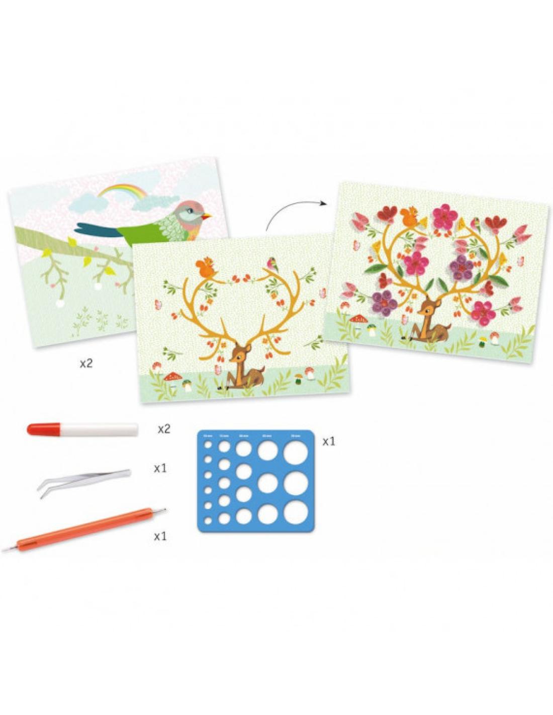 Ce coffret propose aux enfants de découvrir l’art du « quilling » ou « paperolles », grand classique du craft consistant à composer des tableaux avec des spirales de papier. Des outils adaptés et une technique simplifiée permettent à l’enfant de compléter facilement les 2 tableaux proposés. Il enroule les bandelettes multicolores pour former boucles, cercles et autres navettes, puis les colle sur les fonds illustrés. Le plumage de l’oiseau et les bois du cerf se parent de motifs spiralés tout en volume.